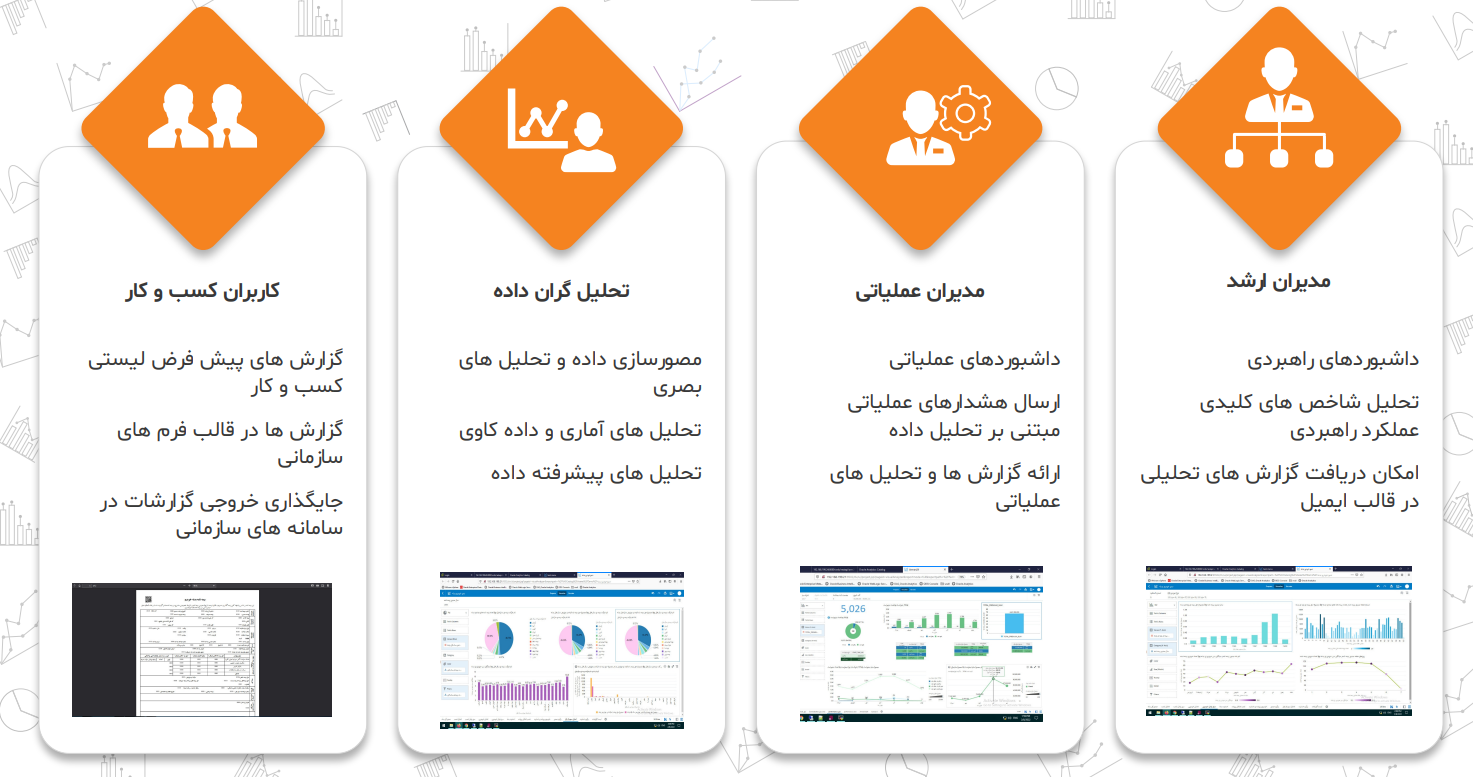 کاربران خواهند توانست کاملا تحت وب، هر نوع گزارش، تحلیل و مصورسازیهای مورد نیاز خود را با استفاده از مدلهای تحلیل آماده شده، تولید و در اختیار سایر کاربران و مدیران قرار دهند.